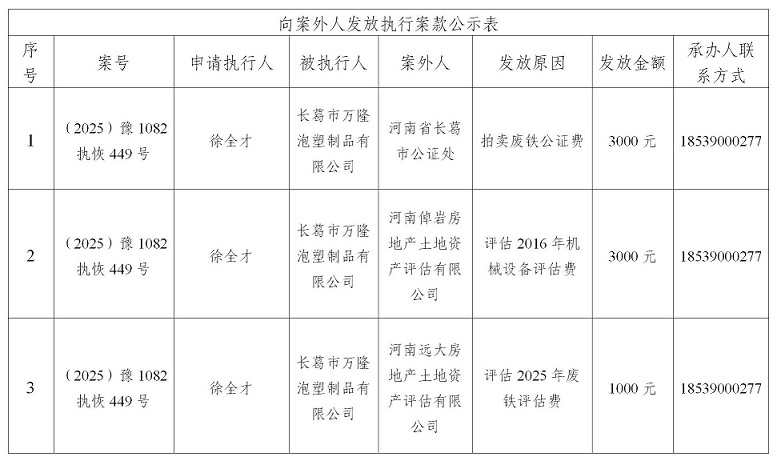 为严格执行案款发放,规范执行案款发放程序,确保案款发放安全,根据《最高人民法院关于执行款物管理工作的规定》等相关规定要求,现将本院拟向案外人发放的案款公示如下(详见下表),公示期为三个自然日(2025年8月28日---2025年8月30日),公示期间,案件当事人或其他案外人如有异议,应当在公示期内提出并提交相关证据材料,公示期满无异议的,本院将按执行案款管理的相关规定办理发还手续。