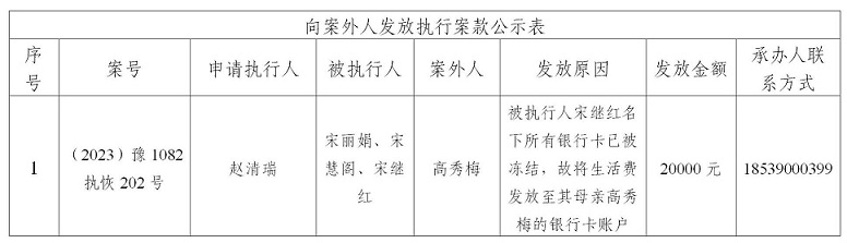 为严格执行案款发放,规范执行案款发放程序,确保案款发放安全,根据《最高人民法院关于执行款物管理工作的规定》等相关规定要求,现将本院拟向案外人发放的案款公示如下(详见下表),公示期为三个自然日(2025年9月8日---2025年9月10日),公示期间,案件当事人或其他案外人如有异议,应当在公示期内提出并提交相关证据材料,公示期满无异议的,本院将按执行案款管理的相关规定办理发还手续。