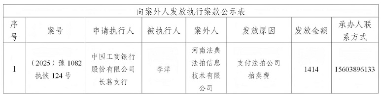 为严格执行案款发放,规范执行案款发放程序,确保案款发放安全,根据《最高人民法院关于执行款物管理工作的规定》等相关规定要求,现将本院拟向案外人发放的案款公示如下(详见下表),公示期为三个自然日(2025年9月29日---2025年10月1日),公示期间,案件当事人或其他案外人如有异议,应当在公示期内提出并提交相关证据材料,公示期满无异议的,本院将按执行案款管理的相关规定办理发还手续。
