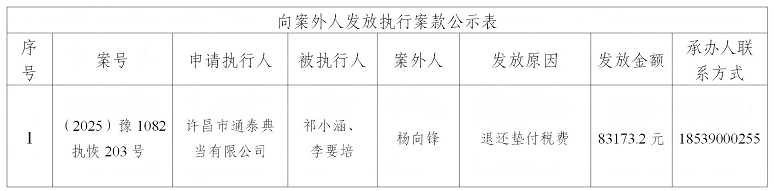 为严格执行案款发放,规范执行案款发放程序,确保案款发放安全,根据《最高人民法院关于执行款物管理工作的规定》等相关规定要求,现将本院拟向案外人发放的案款公示如下(详见下表),公示期为三个自然日(2025年9月28日---2025年9月30日),公示期间,案件当事人或其他案外人如有异议,应当在公示期内提出并提交相关证据材料,公示期满无异议的,本院将按执行案款管理的相关规定办理发还手续。