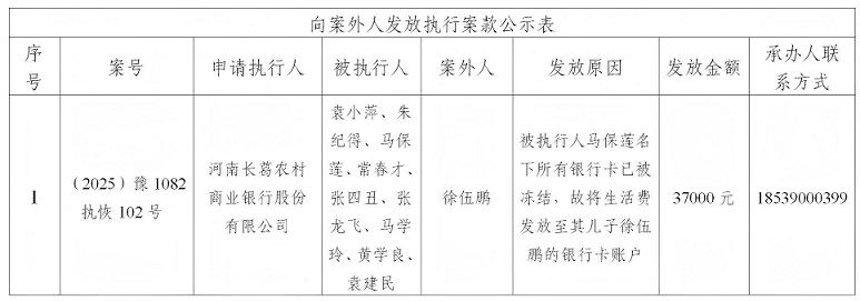 为严格执行案款发放,规范执行案款发放程序,确保案款发放安全,根据《最高人民法院关于执行款物管理工作的规定》等相关规定要求,现将本院拟向案外人发放的案款公示如下(详见下表),公示期为三个自然日(2025年9月27日---2025年9月29日),公示期间,案件当事人或其他案外人如有异议,应当在公示期内提出并提交相关证据材料,公示期满无异议的,本院将按执行案款管理的相关规定办理发还手续。