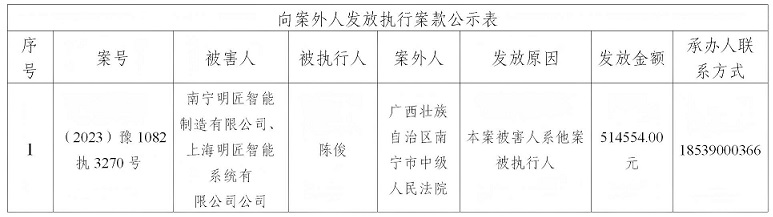 为严格执行案款发放,规范执行案款发放程序,确保案款发放安全,根据《最高人民法院关于执行款物管理工作的规定》等相关规定要求,现将本院拟向案外人发放的案款公示如下(详见下表),公示期为三个自然日(2025年10月10日---2025年10月12日),公示期间,案件当事人或其他案外人如有异议,应当在公示期内提出并提交相关证据材料,公示期满无异议的,本院将按执行案款管理的相关规定办理发还手续。