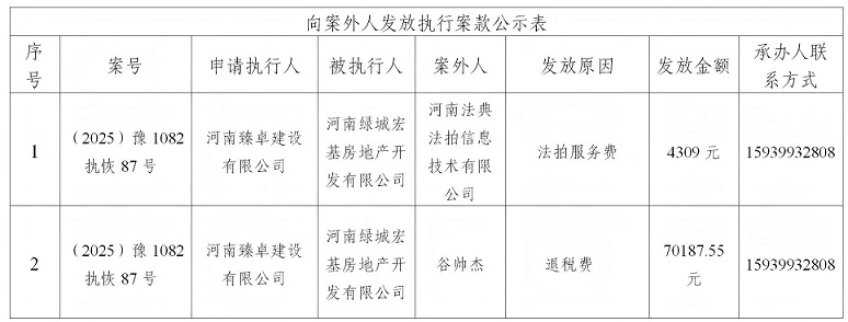 为严格执行案款发放,规范执行案款发放程序,确保案款发放安全,根据《最高人民法院关于执行款物管理工作的规定》等相关规定要求,现将本院拟向案外人发放的案款公示如下(详见下表),公示期为三个自然日(2025年10月11日---2025年10月13日),公示期间,案件当事人或其他案外人如有异议,应当在公示期内提出并提交相关证据材料,公示期满无异议的,本院将按执行案款管理的相关规定办理发还手续。
