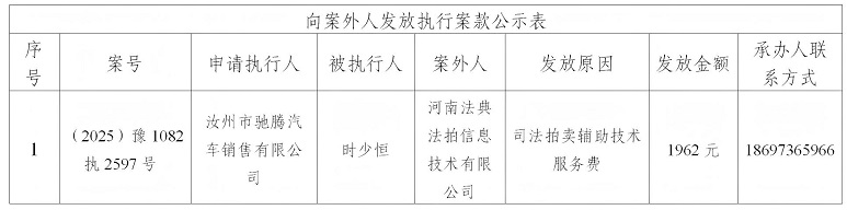为严格执行案款发放,规范执行案款发放程序,确保案款发放安全,根据《最高人民法院关于执行款物管理工作的规定》等相关规定要求,现将本院拟向案外人发放的案款公示如下(详见下表),公示期为三个自然日(2025年10月14日---2025年10月16日),公示期间,案件当事人或其他案外人如有异议,应当在公示期内提出并提交相关证据材料,公示期满无异议的,本院将按执行案款管理的相关规定办理发还手续。