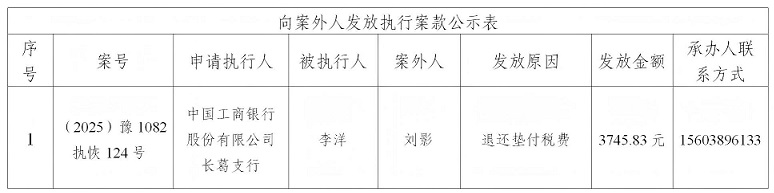 为严格执行案款发放,规范执行案款发放程序,确保案款发放安全,根据《最高人民法院关于执行款物管理工作的规定》等相关规定要求,现将本院拟向案外人发放的案款公示如下(详见下表),公示期为三个自然日(2025年10月15日---2025年10月17日),公示期间,案件当事人或其他案外人如有异议,应当在公示期内提出并提交相关证据材料,公示期满无异议的,本院将按执行案款管理的相关规定办理发还手续。