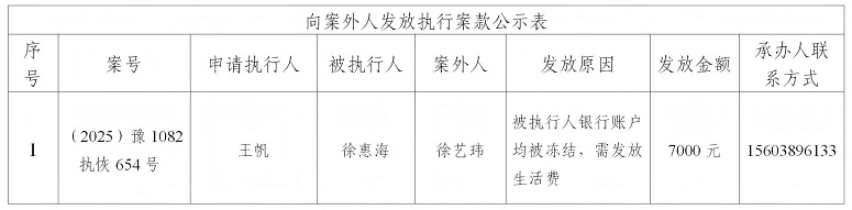 为严格执行案款发放,规范执行案款发放程序,确保案款发放安全,根据《最高人民法院关于执行款物管理工作的规定》等相关规定要求,现将本院拟向案外人发放的案款公示如下(详见下表),公示期为三个自然日(2025年11月10日---2025年11月12日),公示期间,案件当事人或其他案外人如有异议,应当在公示期内提出并提交相关证据材料,公示期满无异议的,本院将按执行案款管理的相关规定办理发还手续。
