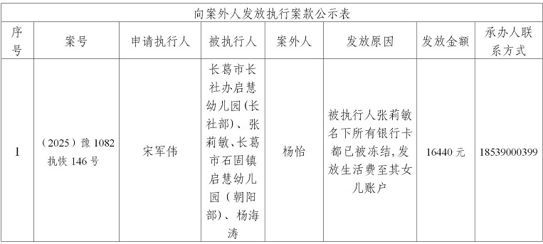 为严格执行案款发放,规范执行案款发放程序,确保案款发放安全,根据《最高人民法院关于执行款物管理工作的规定》等相关规定要求,现将本院拟向案外人发放的案款公示如下(详见下表),公示期为三个自然日(2025年11月18日---2025年11月20日),公示期间,案件当事人或其他案外人如有异议,应当在公示期内提出并提交相关证据材料,公示期满无异议的,本院将按执行案款管理的相关规定办理发还手续。