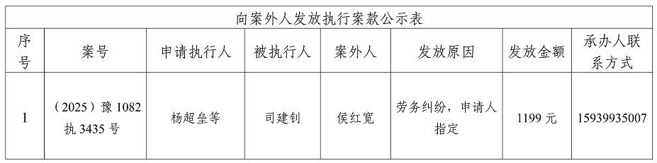为严格执行案款发放,规范执行案款发放程序,确保案款发放安全,根据《最高人民法院关于执行款物管理工作的规定》等相关规定要求,现将本院拟向案外人发放的案款公示如下(详见下表),公示期为三个自然日(2025年11月27日---2025年11月29日),公示期间,案件当事人或其他案外人如有异议,应当在公示期内提出并提交相关证据材料,公示期满无异议的,本院将按执行案款管理的相关规定办理发还手续。