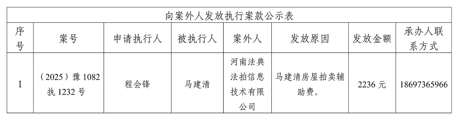 为严格执行案款发放,规范执行案款发放程序,确保案款发放安全,根据《最高人民法院关于执行款物管理工作的规定》等相关规定要求,现将本院拟向案外人发放的案款公示如下(详见下表),公示期为三个自然日(2025年12月03日---2025年12月05日),公示期间,案件当事人或其他案外人如有异议,应当在公示期内提出并提交相关证据材料,公示期满无异议的,本院将按执行案款管理的相关规定办理发还手续。