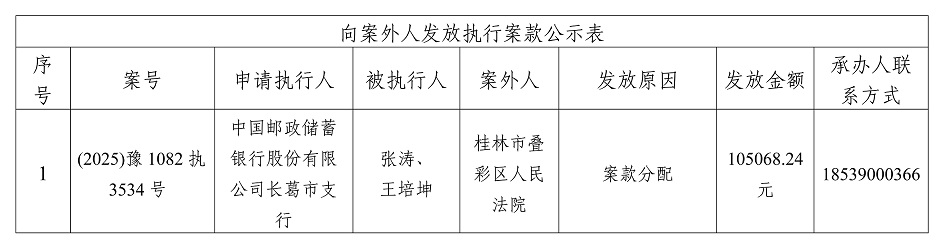 为严格执行案款发放,规范执行案款发放程序,确保案款发放安全,根据《最高人民法院关于执行款物管理工作的规定》等相关规定要求,现将本院拟向案外人发放的案款公示如下(详见下表),公示期为三个自然日(2025年12月5日---2025年12月7日),公示期间,案件当事人或其他案外人如有异议,应当在公示期内提出并提交相关证据材料,公示期满无异议的,本院将按执行案款管理的相关规定办理发还手续。
