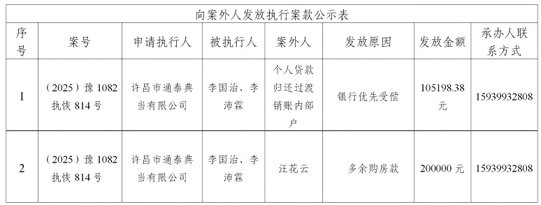 为严格执行案款发放,规范执行案款发放程序,确保案款发放安全,根据《最高人民法院关于执行款物管理工作的规定》等相关规定要求,现将本院拟向案外人发放的案款公示如下(详见下表),公示期为三个自然日(2025年12月23日---2025年12月25日),公示期间,案件当事人或其他案外人如有异议,应当在公示期内提出并提交相关证据材料,公示期满无异议的,本院将按执行案款管理的相关规定办理发还手续。