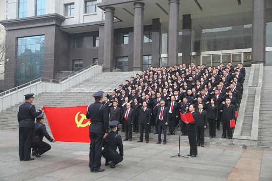 随后,在党组成员、政治部主任李春红的领誓下,全体党员干警面向党旗,举起右拳,重温入党誓词。铿锵有力的誓言回荡在广场上空,既是对初心使命的重温坚守,也是对司法事业的郑重承诺。