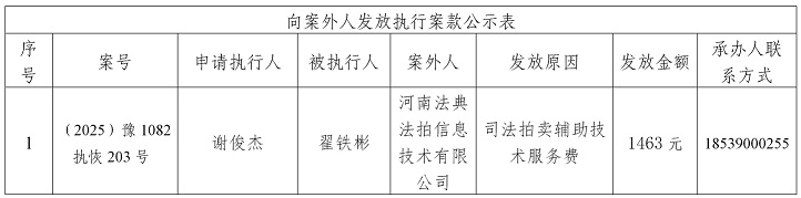 为严格执行案款发放,规范执行案款发放程序,确保案款发放安全,根据《最高人民法院关于执行款物管理工作的规定》等相关规定要求,现将本院拟向案外人发放的案款公示如下(详见下表),公示期为三个自然日(2026年2月6日---2025年2月8日),公示期间,案件当事人或其他案外人如有异议,应当在公示期内提出并提交相关证据材料,公示期满无异议的,本院将按执行案款管理的相关规定办理发还手续。
