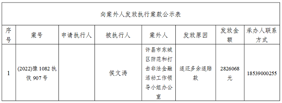 为严格执行案款发放,规范执行案款发放程序,确保案款发放安全,根据《最高人民法院关于执行款物管理工作的规定》等相关规定要求,现将本院拟向案外人发放的案款公示如下(详见下表),公示期为三个自然日(2025年7月15日---2025年7月17日),公示期间,案件当事人或其他案外人如有异议,应当在公示期内提出并提交相关证据材料,公示期满无异议的,本院将按执行案款管理的相关规定办理发还手续。