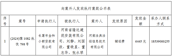 为严格执行案款发放,规范执行案款发放程序,确保案款发放安全,根据《最高人民法院关于执行款物管理工作的规定》等相关规定要求,现将本院拟向案外人发放的案款公示如下(详见下表),公示期为三个自然日(2025年3月15日---2025年3月17日),公示期间,案件当事人或其他案外人如有异议,应当在公示期内提出并提交相关证据材料,公示期满无异议的,本院将按执行案款管理的相关规定办理发还手续。