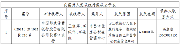 河南省长葛市人民法院关于向案外人发放执行案款的公示 (2021)豫1082执210号