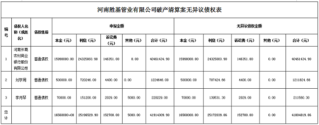 附:《河南胜基管业有限公司破产清算案无异议债权表》