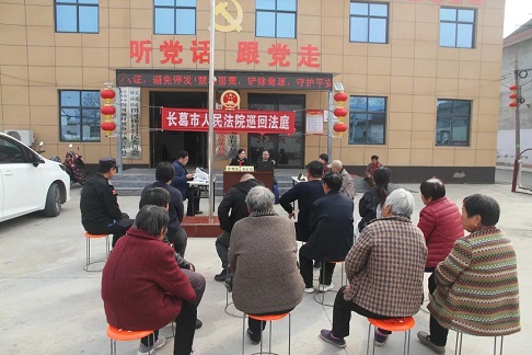 3月24日,春日暖阳,坡胡镇拐河杨村的广场上,长葛法院坡胡人民法庭正在巡回审理一起赡养纠纷案件。
